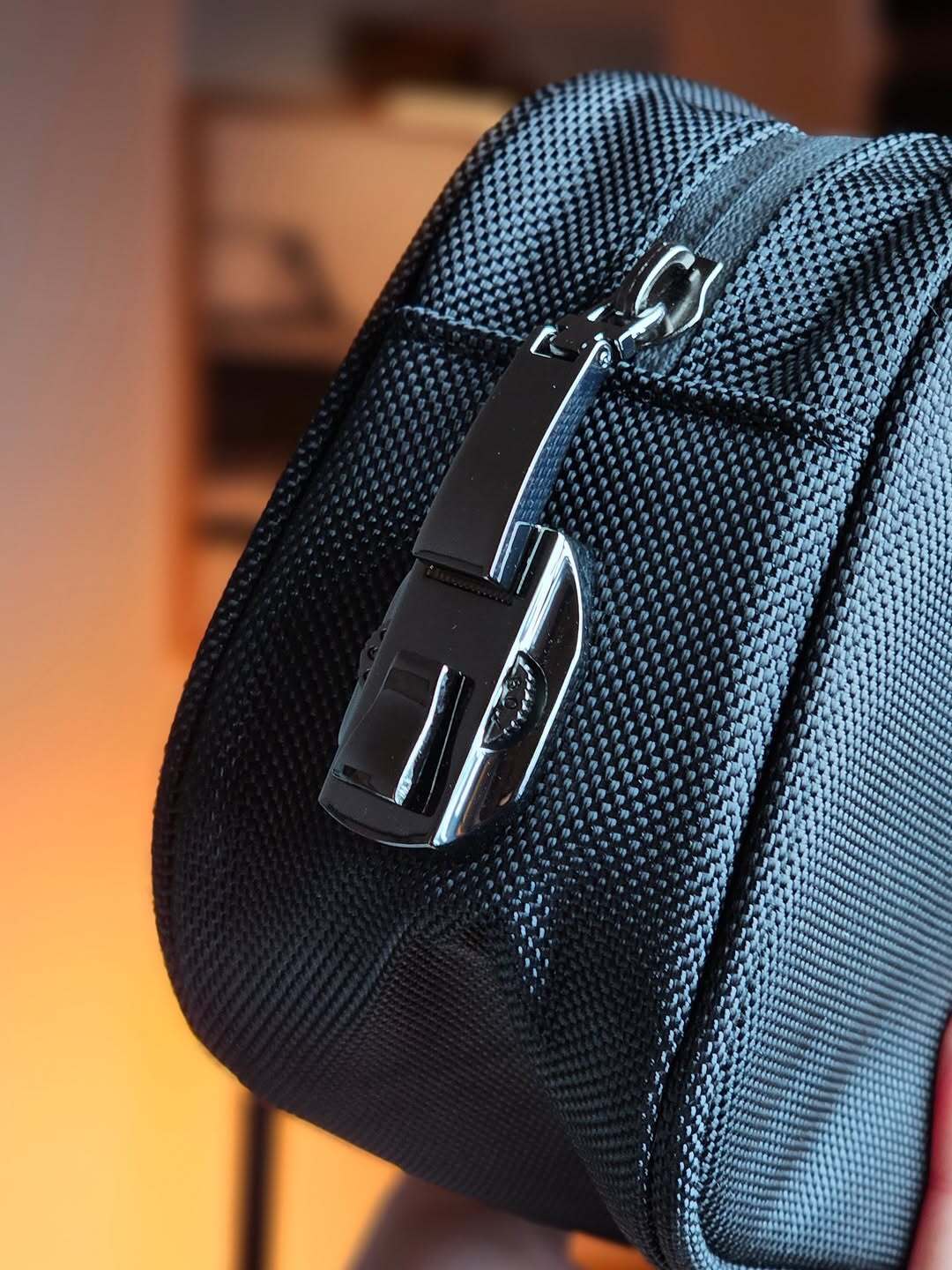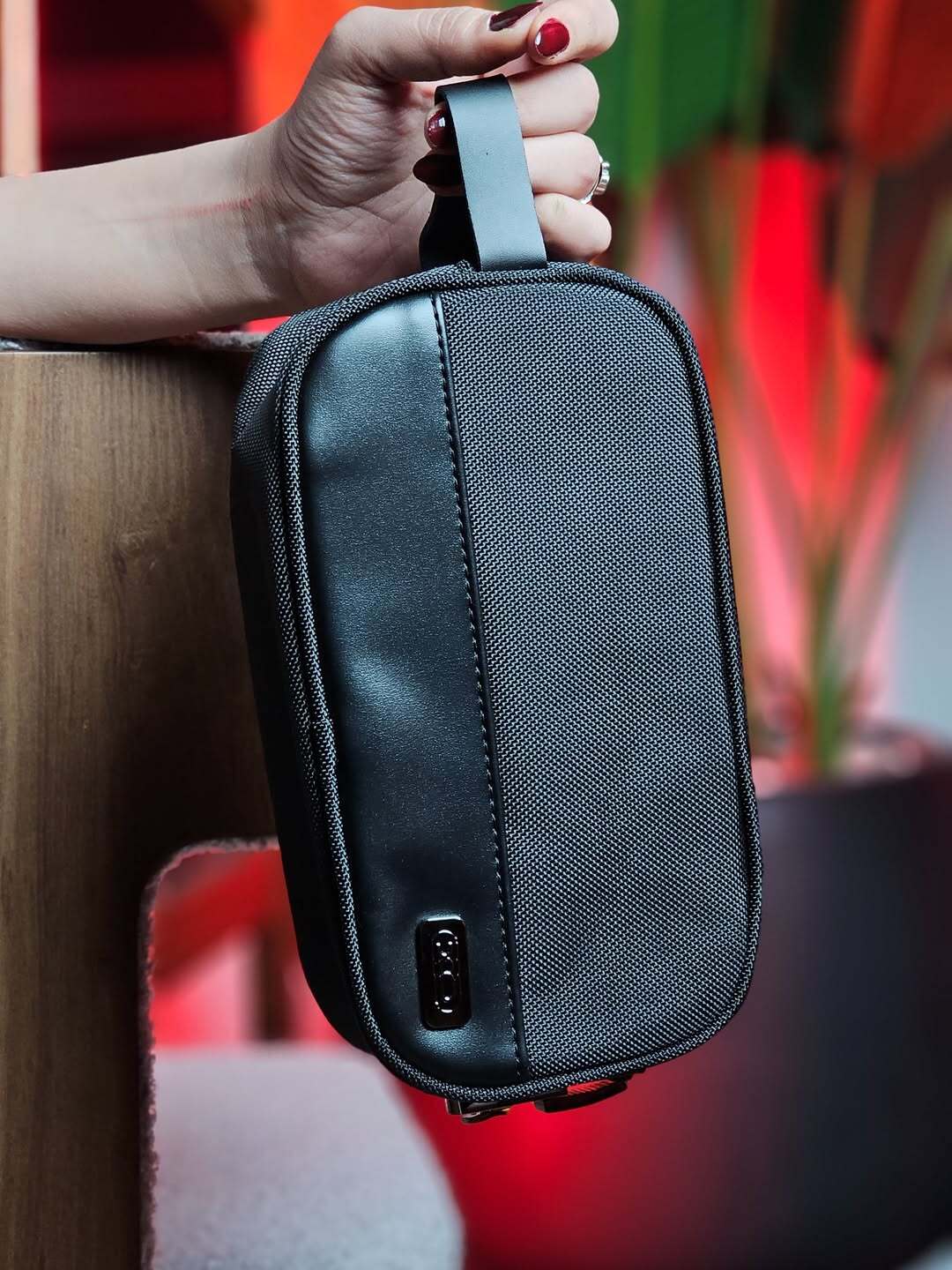 - Cadenas à combinaison intégré — la pochette est munie d’une serrure à combinaison.